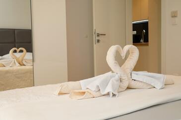 Ferienwohnung bietet Platz für 4 Gäste. Die Betten sind in Schlafzimmern, die es 2 gibt, innerhalb einer Gesamtfläche von 65m2, angeordnet. Die Gäste haben einen eigenen Balkon zur Verfügung, auf der sie in warmen Sommernächten genießen können.