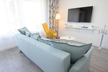 Ferienwohnung bietet Platz für 4 Gäste. Die Betten sind in Schlafzimmern, die es 1 gibt, und in Wohnzimmer, innerhalb einer Gesamtfläche von 52m2, angeordnet. Die Gäste haben eine eigene Terrasse zur Verfügung, auf der sie in warmen Sommernächten genießen können. Das Apartment bietet Meerblick. Es ist erlaubt, Speisen auf dem Gemeinschafts-Grill vorzubereiten.