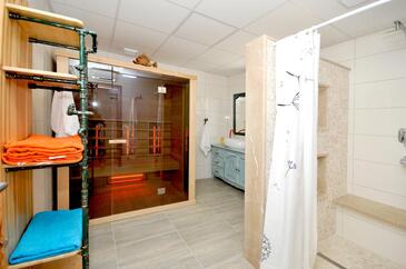 Haus bietet Platz für 8 Gäste. Die Betten sind in Schlafzimmern, die es 4 gibt, innerhalb einer Gesamtfläche von 142m2, angeordnet. Die Gäste haben eine eigene Terrasse zur Verfügung, auf der sie in warmen Sommernächten genießen können. Das Haus bietet Meerblick. Für vollen Genuss und Entspannung gibt es einen privaten Grill für Gäste dieser Unterkunft. Während ihres Aufenthalts können sich Gäste im privaten Schwimmbad entspannen.