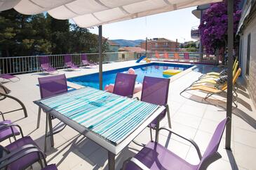Haus bietet Platz für 12 Gäste. Die Betten sind in Schlafzimmern, die es 5 gibt, und in Esszimmer, innerhalb einer Gesamtfläche von 137m2, angeordnet. Die Gäste haben eine eigene Terrasse zur Verfügung, auf der sie in warmen Sommernächten genießen können. Das Haus bietet Meerblick. Es ist erlaubt, Speisen auf dem Gemeinschafts-Grill vorzubereiten. Während ihres Aufenthalts können sich Gäste im privaten Schwimmbad entspannen. In der Unterkunftseinheit besteht die Möglichkeit des Mitbringens von Haustieren, und die Dienstleistung ist im Preis der Unterkunft enthalten. Räume der gebuchten Unterkunftseinheit werden nicht in eine Ganze verbunden. In der gebuchten Unterkunftseinheit zahlt man am Ort ein Depositum ( der Preis ist an der Internetseite angeführt ).