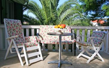 Ferienwohnung bietet Platz für 4 Gäste. Die Betten sind in Schlafzimmern, die es 2 gibt, innerhalb einer Gesamtfläche von 42m2, angeordnet. Die Gäste haben eine eigene Terrasse zur Verfügung, auf der sie in warmen Sommernächten genießen können. Das Apartment bietet Meerblick. Es ist erlaubt, Speisen auf dem Gemeinschafts-Grill vorzubereiten.