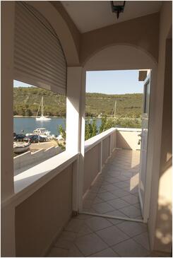 Ferienwohnung bietet Platz für 4 Gäste. Die Betten sind in Schlafzimmern, die es 2 gibt, innerhalb einer Gesamtfläche von 46m2, angeordnet. Die Gäste haben eine eigene Terrasse zur Verfügung, auf der sie in warmen Sommernächten genießen können. Das Apartment bietet Meerblick. Es ist erlaubt, Speisen auf dem Gemeinschafts-Grill vorzubereiten.