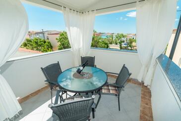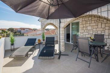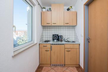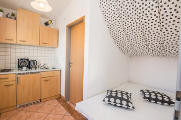 Studio bietet Platz für 3 Gäste. Die Betten sind in Schlafzimmern, die es 1 gibt, und in Wohnzimmer, innerhalb einer Gesamtfläche von 29m2, angeordnet. Die Gäste haben eine eigene Terrasse zur Verfügung, auf der sie in warmen Sommernächten genießen können. Das Studio-Apartment bietet Meerblick. Es ist erlaubt, Speisen auf dem Gemeinschafts-Grill vorzubereiten.