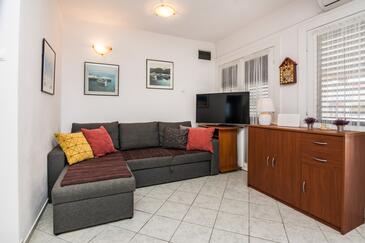 Ferienwohnung bietet Platz für 6 Gäste. Die Betten sind in Schlafzimmern, die es 2 gibt, und in Wohnzimmer, innerhalb einer Gesamtfläche von 46m2, angeordnet. Die Gäste haben eine eigene Terrasse zur Verfügung, auf der sie in warmen Sommernächten genießen können. Es ist erlaubt, Speisen auf dem Gemeinschafts-Grill vorzubereiten.