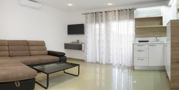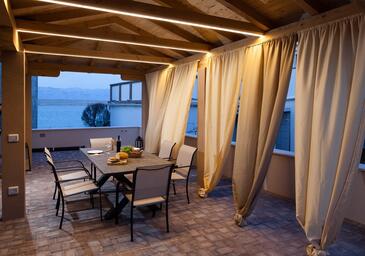 Ferienwohnung bietet Platz für 6 Gäste. Die Betten sind in Schlafzimmern, die es 2 gibt, und in Wohnzimmer, innerhalb einer Gesamtfläche von 72m2, angeordnet. Die Gäste haben eine eigene Terrasse zur Verfügung, auf der sie in warmen Sommernächten genießen können. Das Apartment bietet Meerblick. Es ist erlaubt, Speisen auf dem Gemeinschafts-Grill vorzubereiten.
