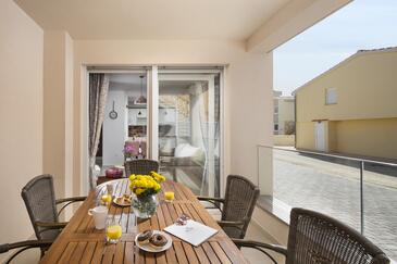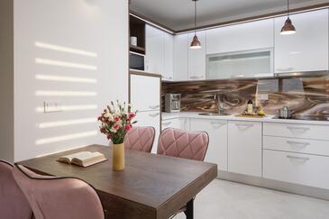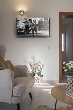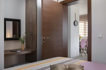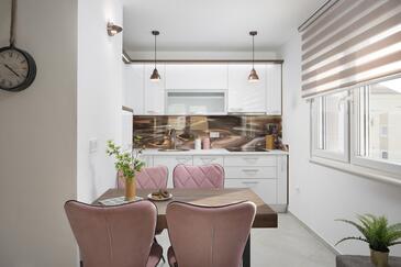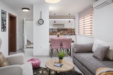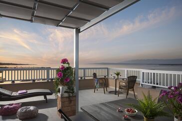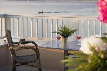 Ferienwohnung bietet Platz für 4 Gäste. Die Betten sind in Schlafzimmern, die es 2 gibt, innerhalb einer Gesamtfläche von 50m2, angeordnet. Die Gäste haben eine eigene Terrasse zur Verfügung, auf der sie in warmen Sommernächten genießen können. Das Apartment bietet Meerblick. Es ist erlaubt, Speisen auf dem Gemeinschafts-Grill vorzubereiten.