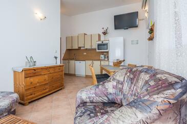 Ferienwohnung bietet Platz für 4 Gäste. Die Betten sind in Schlafzimmern, die es 1 gibt, und in Wohnzimmer, innerhalb einer Gesamtfläche von 36m2, angeordnet. Die Gäste haben eine eigene Terrasse zur Verfügung, auf der sie in warmen Sommernächten genießen können. Es ist erlaubt, Speisen auf dem Gemeinschafts-Grill vorzubereiten.