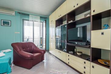 Studio bietet Platz für 3 Gäste. Die Betten sind in Wohnzimmer, innerhalb einer Gesamtfläche von 40m2, angeordnet. Die Gäste haben einen eigenen Balkon zur Verfügung, auf der sie in warmen Sommernächten genießen können. Das Studio-Apartment bietet Meerblick. Es ist erlaubt, Speisen auf dem Gemeinschafts-Grill vorzubereiten.