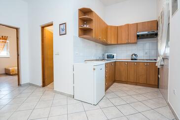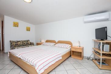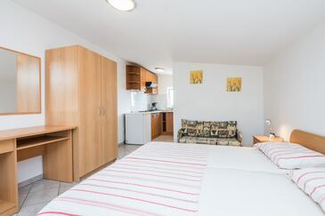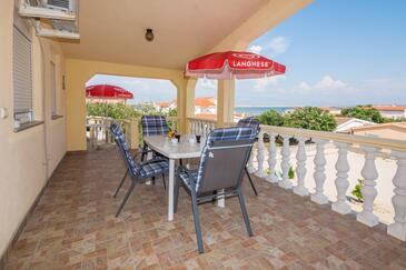 Ferienwohnung bietet Platz für 4 Gäste. Die Betten sind in Schlafzimmern, die es 2 gibt, innerhalb einer Gesamtfläche von 50m2, angeordnet. Die Gäste haben eine eigene Terrasse zur Verfügung, auf der sie in warmen Sommernächten genießen können. Das Apartment bietet Meerblick. Es ist erlaubt, Speisen auf dem Gemeinschafts-Grill vorzubereiten.