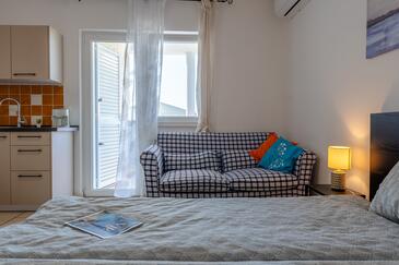 Ferienwohnung bietet Platz für 5 Gäste. Die Betten sind in Schlafzimmern, die es 2 gibt, und in Wohnzimmer, innerhalb einer Gesamtfläche von 35m2, angeordnet. Die Gäste haben einen eigenen Balkon zur Verfügung, auf der sie in warmen Sommernächten genießen können. Das Apartment bietet Meerblick. Es ist erlaubt, Speisen auf dem Gemeinschafts-Grill vorzubereiten.