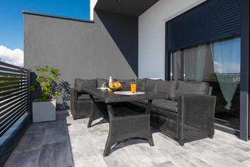 Ferienwohnung bietet Platz für 5 Gäste. Die Betten sind in Schlafzimmern, die es 2 gibt, und in Wohnzimmer, innerhalb einer Gesamtfläche von 68m2, angeordnet. Die Gäste haben eine eigene Terrasse zur Verfügung, auf der sie in warmen Sommernächten genießen können. Das Apartment bietet Meerblick. Es ist erlaubt, Speisen auf dem Gemeinschafts-Grill vorzubereiten.