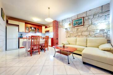 Ferienwohnung bietet Platz für 4 Gäste. Die Betten sind in Schlafzimmern, die es 2 gibt, innerhalb einer Gesamtfläche von 57m2, angeordnet. Die Gäste haben eine eigene Terrasse zur Verfügung, auf der sie in warmen Sommernächten genießen können. Das Apartment bietet Meerblick. Es ist erlaubt, Speisen auf dem Gemeinschafts-Grill vorzubereiten.