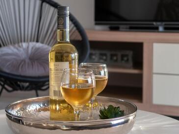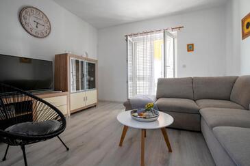 Ferienwohnung bietet Platz für 5 Gäste. Die Betten sind in Schlafzimmern, die es 2 gibt, und in Wohnzimmer, innerhalb einer Gesamtfläche von 80m2, angeordnet. Die Gäste haben eine eigene Terrasse zur Verfügung, auf der sie in warmen Sommernächten genießen können. Das Apartment bietet Meerblick. Es ist erlaubt, Speisen auf dem Gemeinschafts-Grill vorzubereiten. Räume der gebuchten Unterkunftseinheit werden nicht in eine Ganze verbunden.
