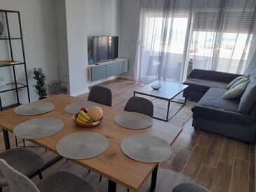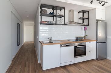 Ferienwohnung bietet Platz für 5 Gäste. Die Betten sind in Schlafzimmern, die es 2 gibt, und in Wohnzimmer, innerhalb einer Gesamtfläche von 64m2, angeordnet. Die Gäste haben einen eigenen Balkon zur Verfügung, auf der sie in warmen Sommernächten genießen können. Das Apartment bietet Meerblick. Es ist erlaubt, Speisen auf dem Gemeinschafts-Grill vorzubereiten.