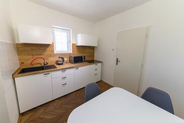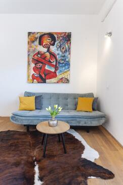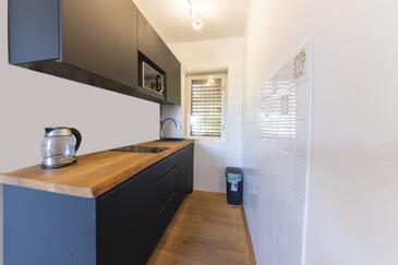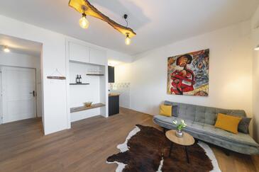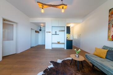Ferienwohnung bietet Platz für 5 Gäste. Die Betten sind in Schlafzimmern, die es 2 gibt, und in Wohnzimmer, innerhalb einer Gesamtfläche von 42m2, angeordnet. Die Gäste haben eine eigene Terrasse zur Verfügung, auf der sie in warmen Sommernächten genießen können. Das Apartment bietet Meerblick. Es ist erlaubt, Speisen auf dem Gemeinschafts-Grill vorzubereiten.