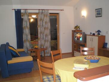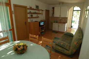 Ferienwohnung bietet Platz für 6 Gäste. Die Betten sind in Schlafzimmern, die es 2 gibt, und in Wohnzimmer, innerhalb einer Gesamtfläche von 49m2, angeordnet. Die Gäste haben eine eigene Terrasse zur Verfügung, auf der sie in warmen Sommernächten genießen können. Das Apartment bietet Meerblick. Es ist erlaubt, Speisen auf dem Gemeinschafts-Grill vorzubereiten.