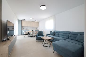 Ferienwohnung bietet Platz für 7 Gäste. Die Betten sind in Schlafzimmern, die es 3 gibt, und in Wohnzimmer, innerhalb einer Gesamtfläche von 77m2, angeordnet. Die Gäste haben eine eigene Terrasse zur Verfügung, auf der sie in warmen Sommernächten genießen können. Das Apartment bietet Meerblick. Es ist erlaubt, Speisen auf dem Gemeinschafts-Grill vorzubereiten.