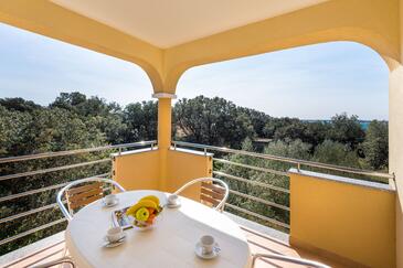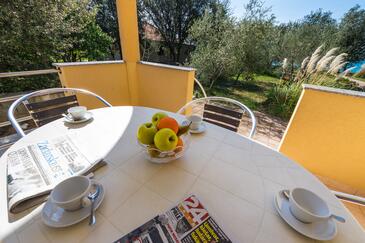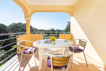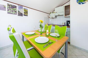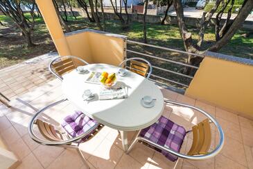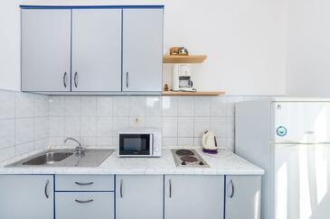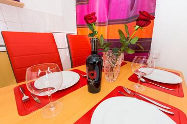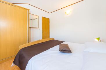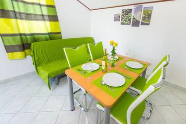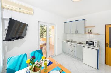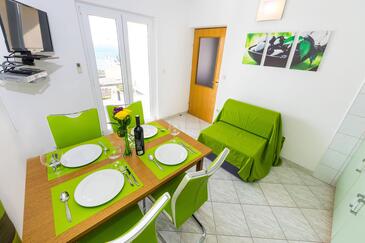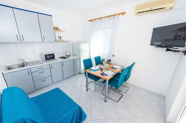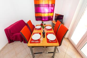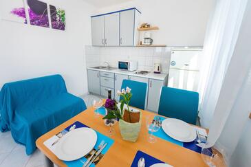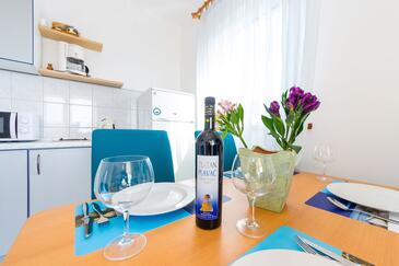 Ferienwohnung bietet Platz für 4 Gäste. Die Betten sind in Schlafzimmern, die es 1 gibt, und in Esszimmer, innerhalb einer Gesamtfläche von 30m2, angeordnet. Die Gäste haben eine eigene Terrasse zur Verfügung, auf der sie in warmen Sommernächten genießen können. Das Apartment bietet Meerblick. Es ist erlaubt, Speisen auf dem Gemeinschafts-Grill vorzubereiten.